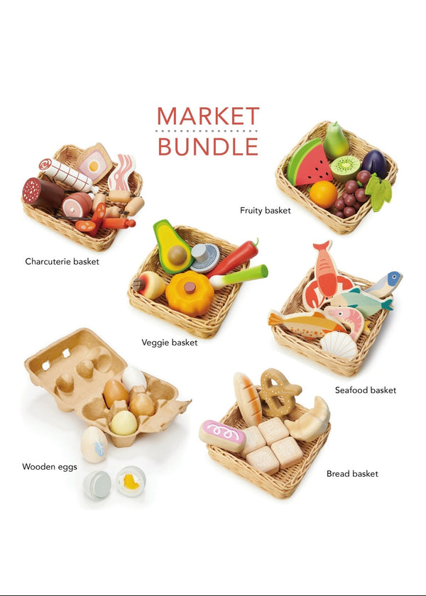 Food Basket Bundle (5 x Food Baskets & 1 x Eggs) | Sustainable Rubber Wood | 3Y+ Imginative Play