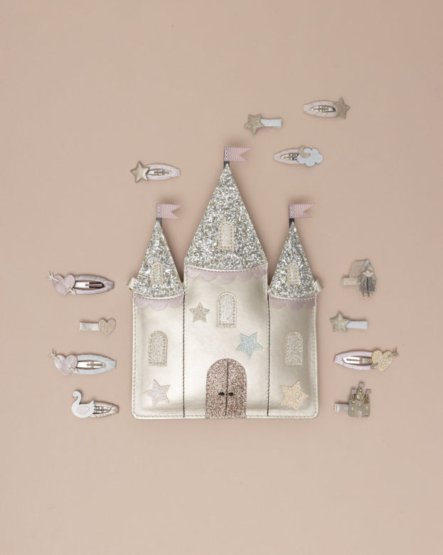 These ballerina mini clic clacs bring a sprinkle of glittery magic with charming swan, star, and cloud designs. Perfect for adding a playful sparkle to any hairstyle. Ideal for little dreamers who love a touch of shimmer and fun! 5 in a pack 4cm ribbon wrapped clic clac clips crafted from the prettiest glitter and metallic fabrics.
