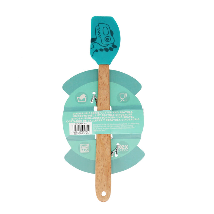 Two piece baking tool set, with a dinosaur shaped cookie cutter and a small spatula, perfect for little hands, to help get every last bit of dough out of the mixing bowl. Great for getting children who are fans of dinosaurs excited about baking their own cookies and biscuits.