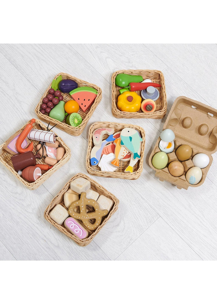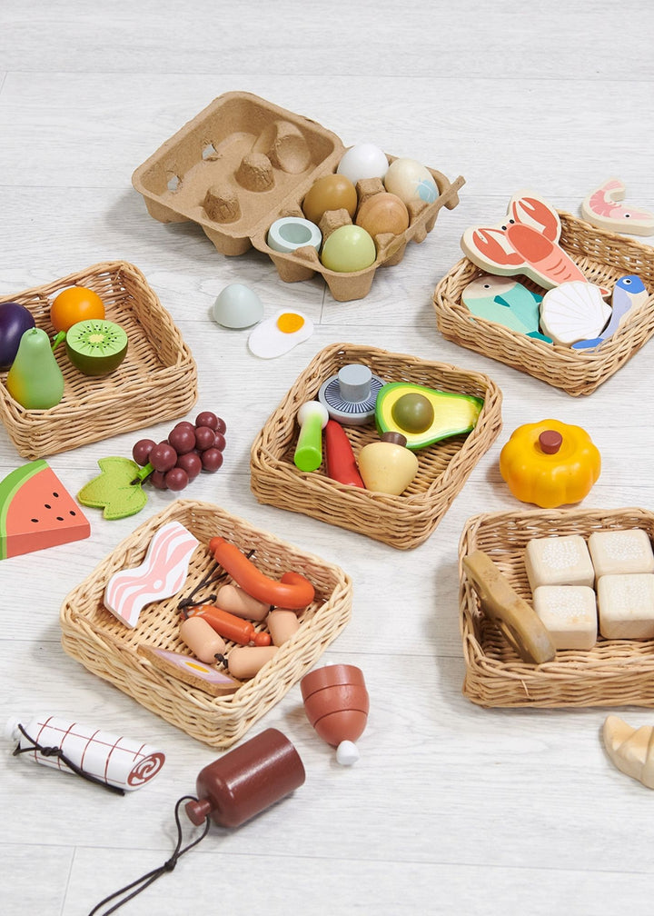 Basket Bundle by Tender Leaf Toys Create your own market! A hand crafted wicker basket set to be played with our market stall. All made from solid wood and completely plastic-free, this wooden play food set is ideal for any sustainable-living to looking to enjoy the wonder of playtime shopping.