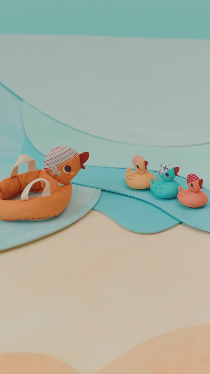 Why do ducklings cross the river? To find their mother, of course! This bath toy is suitable for children and babies from 9 months old. The little duck family entertains your child with its many well-thought-out features! It is a magnetic bath toy: the three little ducks can float separately or together, one behind the other. Not even afraid of the current! Like children, our little ducks love their freedom, but also to find each other and follow their siblings everywhere. Each little duck is a different colour and sports a pretty patterned bandana. But that's not their only special feature! Under each of them, a hidden number is to be discovered: perfect when you start to get familiar with numbers. This educational bath toy would not be the same without mother duck. She also floats on the water and welcomes her little ones on her back made of a net: also very practical for optimal drying outside the bathtub. Equipped with handles, it is super easy to carry in the bathroom and outside! With this duck bath toy, baby is entertained by the little colourful ducklings that float happily around him, so that bath time is marked by relaxation and sensory awakening. As he grows, he catches them, observes them, then puts them together. Finally, it will be time to discover numbers and imagine funny stories with this quartet of funny ducks! This evolving bath game measures 22 x 14 cm and is made of polyester. After each use, you can rinse the Lilliputiens bath toy with clear water and let it air dry. You can even machine wash it at 30° if necessary. Bath time, little ducks!