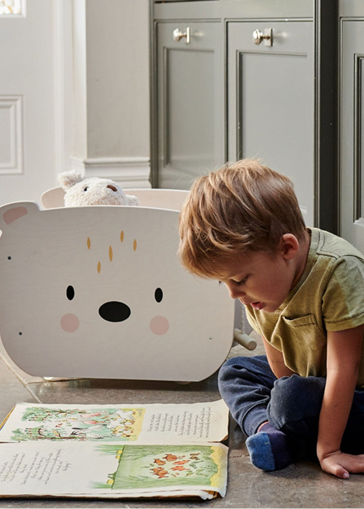 A wooden toy box on 4 wheels! Pull along this handsome polar bear and fill it with your favourite toys and books. Keep your room tidy with this sturdy, stylish toy or book box.