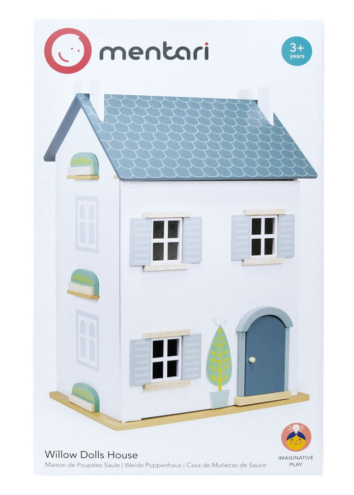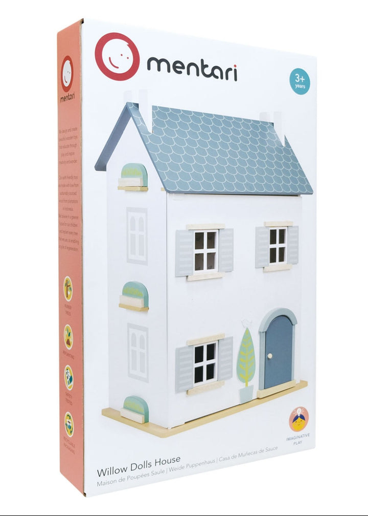 The Willow Doll's House by Mentari is a beautiful townhouse. A two-storey wooden doll's house with extra space in the attic that can be accessed through the removable roof. Opening windows and decorated shutters, illustrated inside walls. House is constructed using window boxes to secure. All pieces are made from sustainable rubber wood and plywood, and finished in a non-toxic paint.