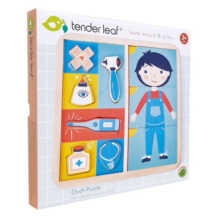 A wooden puzzle for kids by Tender Leaf Toys An educational 12 pieces puzzle that explores how the body is made up. What makes us hurt and what makes us better! Made from sustainable rubber wood. Presented in a shrink wrapped film with a backing card.