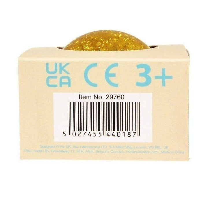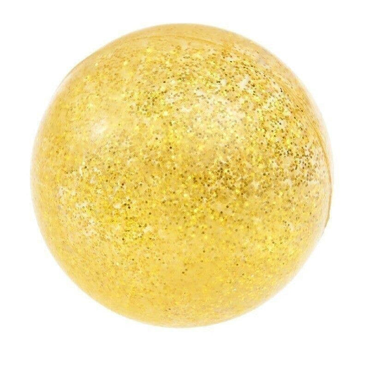 A bouncy rubber ball with gold coloured glitter inside.