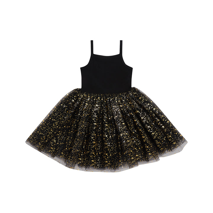 Twirl-ready and full of sparkle, this black-and-gold party dress brings instant celebration to birthdays, discos, and festive gatherings—comfortable enough for play, special enough for keepsake photos.