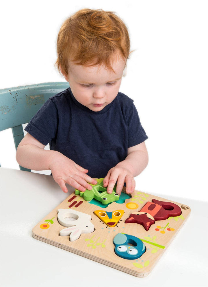 Touchy Feely Animals by Tender Leaf Toys Made for toddlers, A tactile puzzle based on woodland animals. 5 animal shapes to lift, touch and feel, shape sort and match the colours on the baseboard. Made from sustainable rubberwood and plywood and coloured with a soft non-toxic water stain.