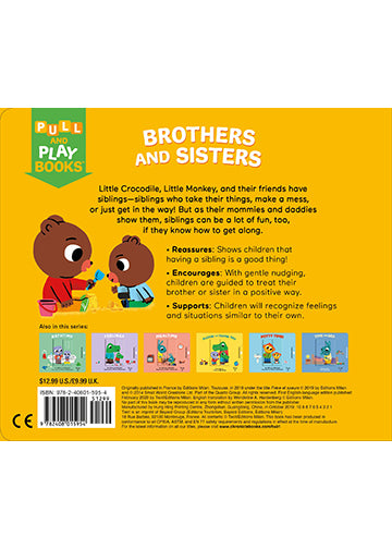 Little Crocodile, Little Monkey, and all their friends have siblings—siblings who take their things, make a mess, or just get in the way! But as their mommies and daddies show them, siblings can be a lot of fun too, if they know how to get along. Supports: Children will recognize feelings and situations similar to their own. Encourages: With gentle nudging, children are guided to treat their sibling in a positive way. Empowers: Using pull-tabs to change the pictures, children realize they are in control.