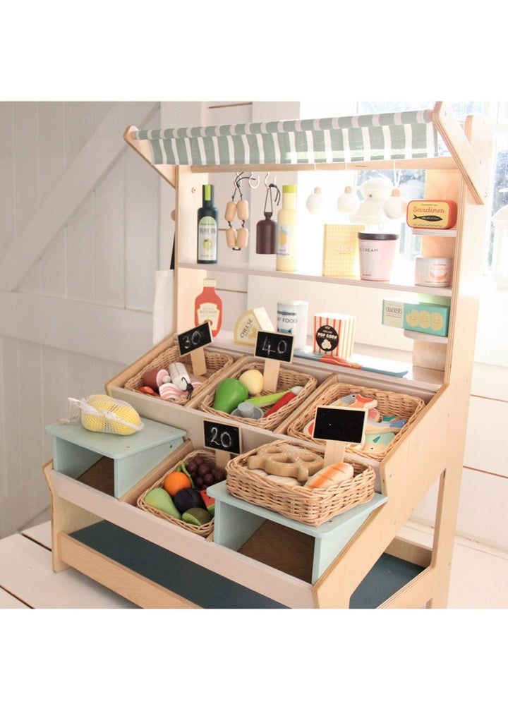 Roll up roll up to the market! A magnificent wooden shopping toy, with shelves and two inter-changeable mini platforms so that it can be adapted to any kind of store. Its pretty striped canopy can be lowered to protect your fresh produce from the beaming sun, and at night we have three cute light bulbs reminiscent of a European market. The set also includes little metal hooks to hang your fruit, four blackboard price markers and a fabric tote bag so that you can shop in style.
