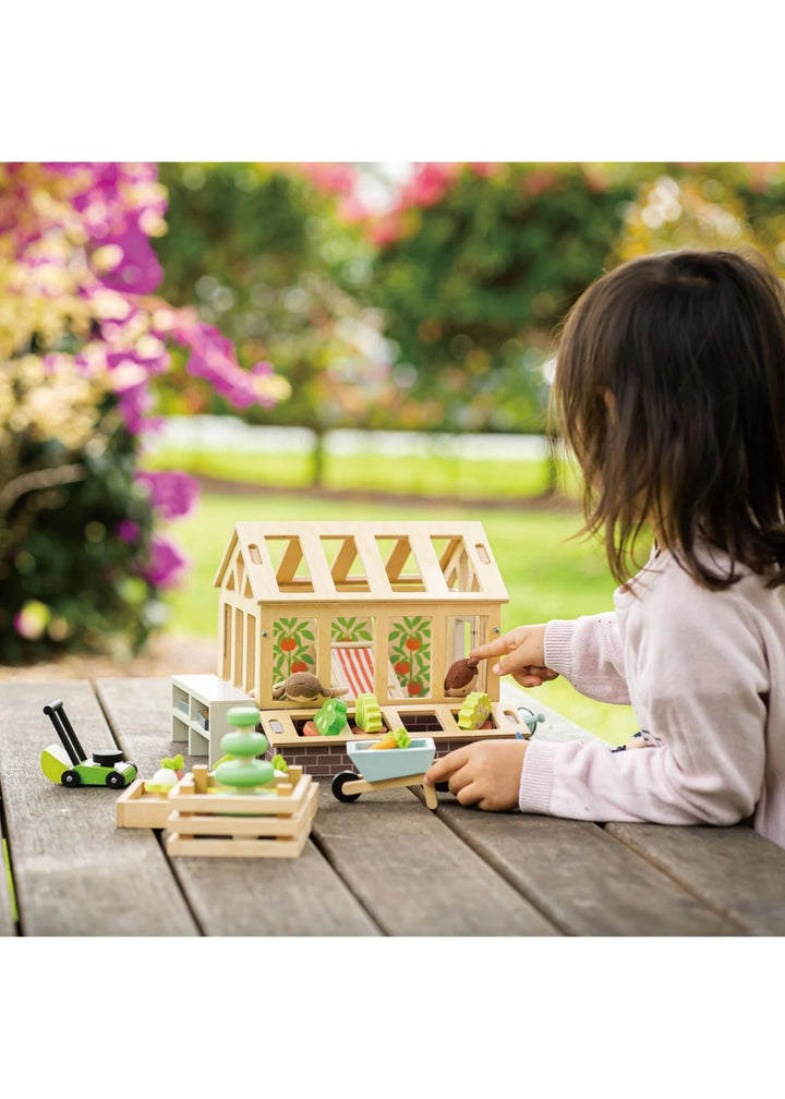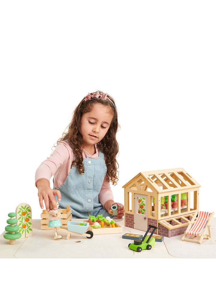 For children who love nature and playing in the garden, this set is ideal for encouraging green fingers. A traditional plywood greenhouse with base has an opening door, and two removable roof panels. It can be filled with two seed trays, a planting bench, four pot plants, and three tomato shrubs. We have included a cold frame for nurturing seeds, a raised bed with nine vegetables, a compost bin, a lawnmower, a watering can, a topiary tree, a wheelbarrow, and last but not least, a deck chair for your dolls to enjoy the fruits of their labour.