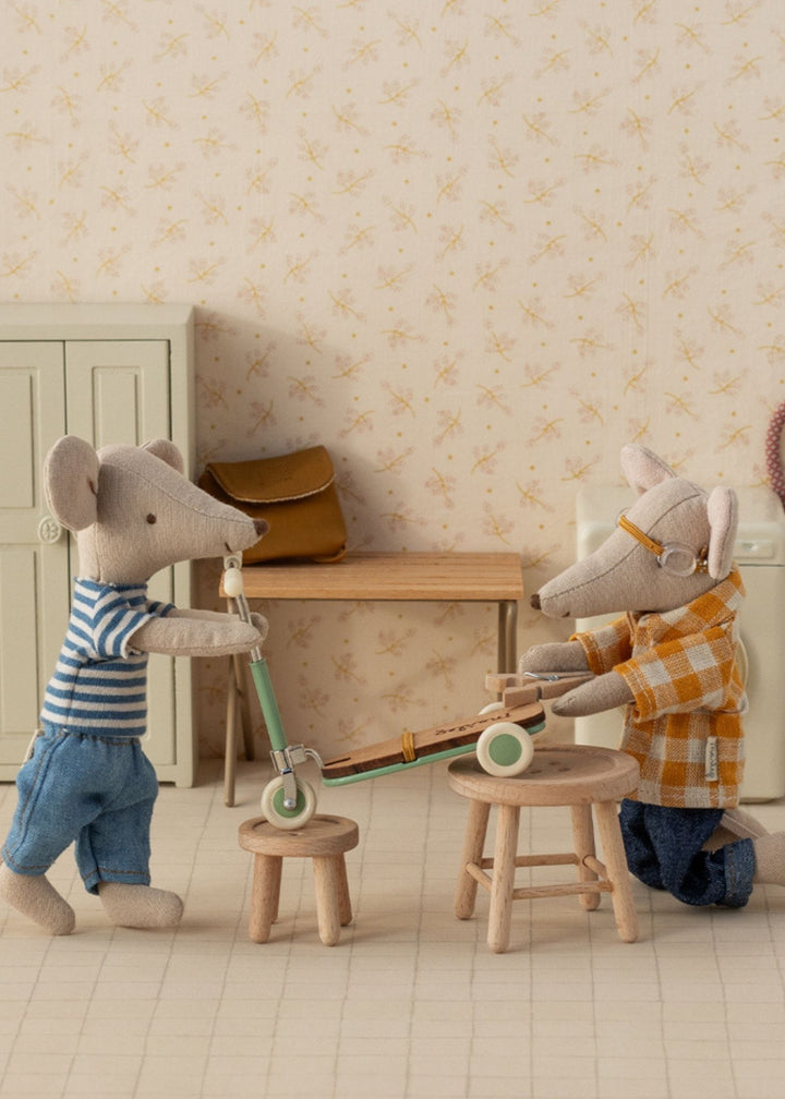 A kickboard with wooden details. The kickboard has a metal stick in the handlebars that makes sure mice with magnets in hands can stay on the board. A small elastic is added on the board and will secure the feet on the board during the ride.