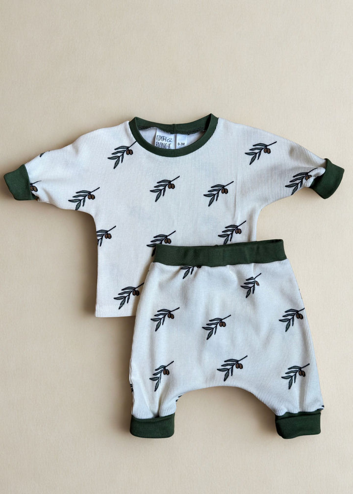 Designed for wriggly little ones, the kimono-cut top makes changes a breeze, while the roomy harem bottoms fit comfortably over both cloth and disposable nappies (sizes 0–3m up to 4Y). Clever folded cuffs on both the top and bottoms can be unfolded as your child grows—giving you a little extra wear and value from each set! The playful olive branch print and deep green trim add a fresh, nature-inspired touch—perfect for sleepy nights or adventurous mornings.