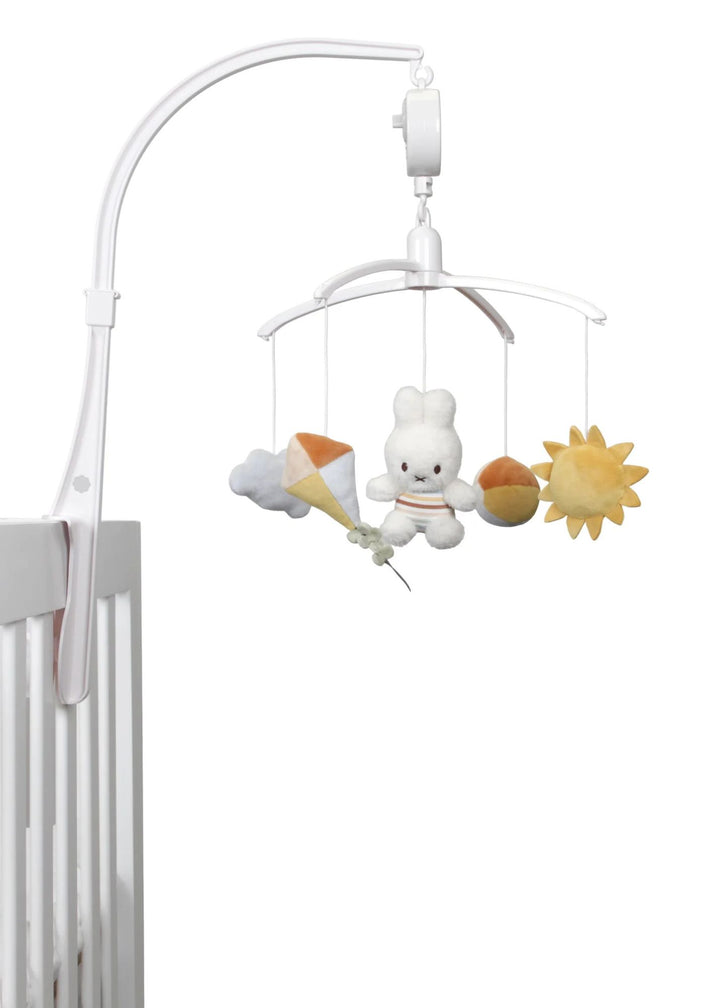 Follow miffy as the song starts playing! She is dressed in Vintage Sunny Stripes by Little Dutch and surrounded by the sun, a cloud, a kite, and a beach ball. As the whole parade circles around, you can relax to the sweet music. Wonderful entertainment for your little one that stimulates visual development. The music mobile is suitable from birth and can be easily attached to a crib or playpen.