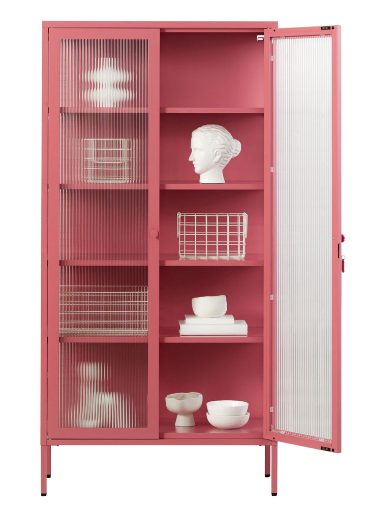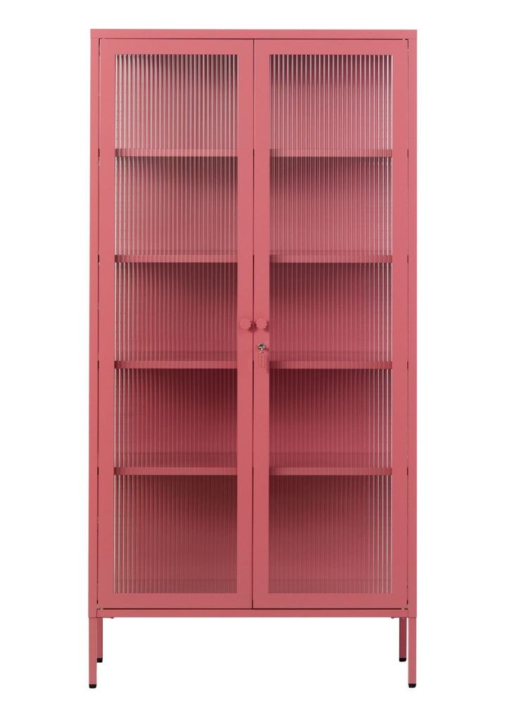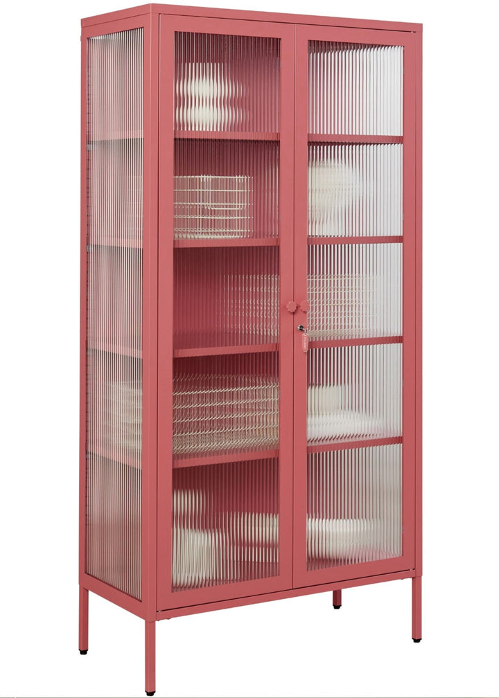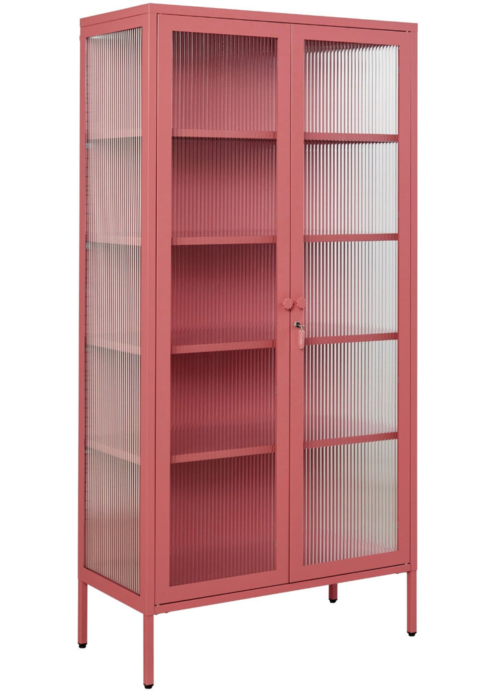 Four adjustable shelves, lockable doors and fluted glass panels set in a metal frame.