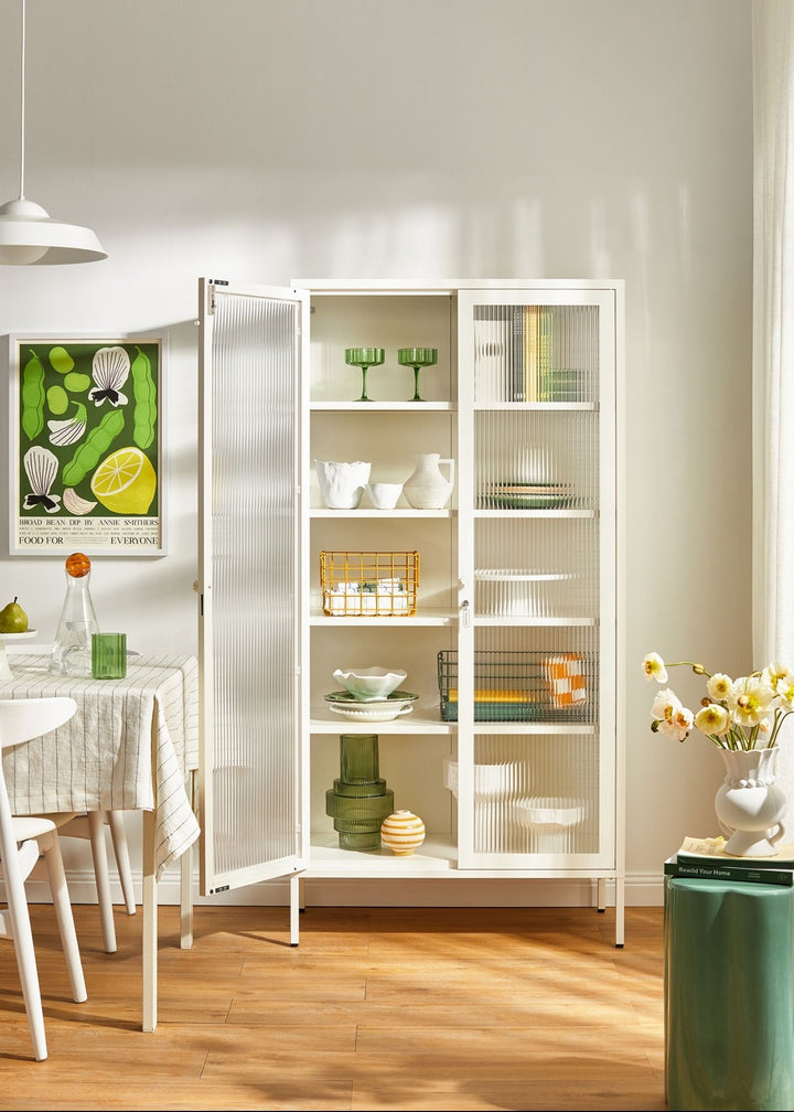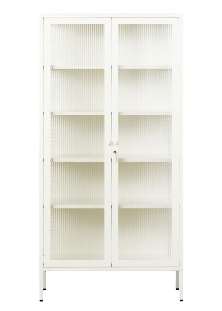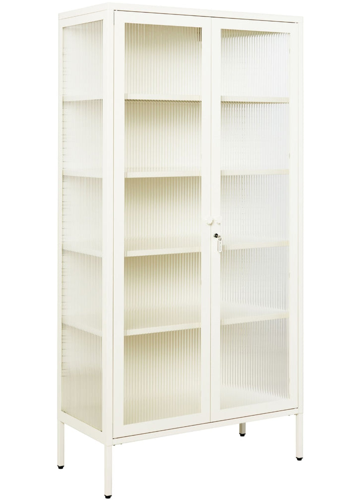 Four adjustable shelves, lockable doors and fluted glass panels set in a metal frame.