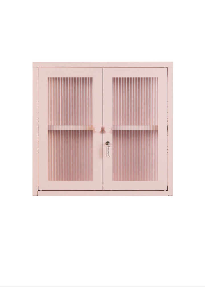 An adjustable shelf, lockable doors and fluted glass panels set in a metal frame.