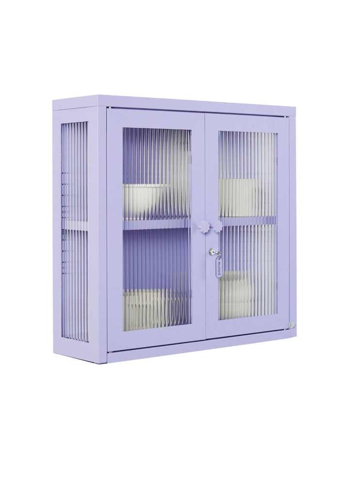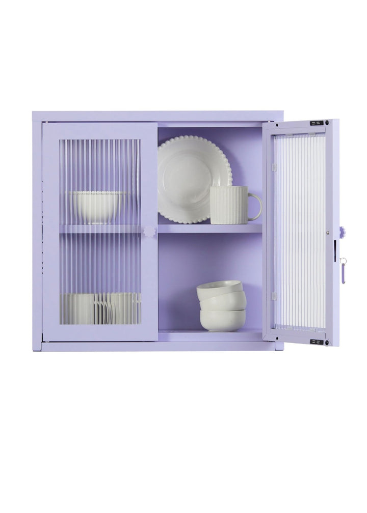 An adjustable shelf, lockable doors and fluted glass panels set in a metal frame.
