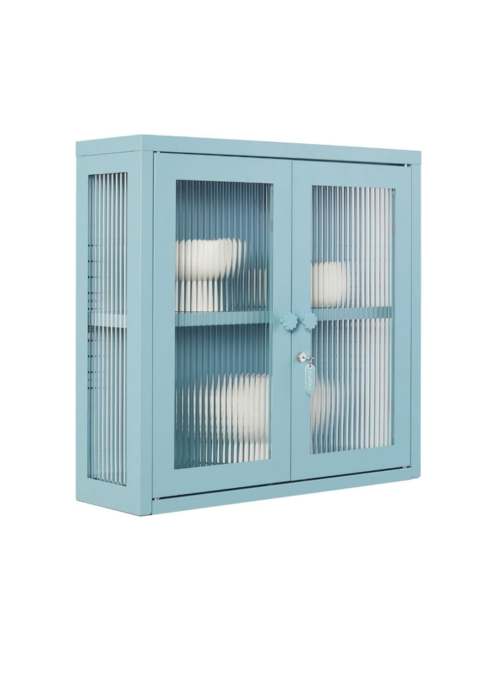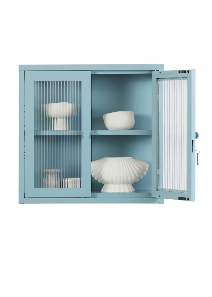 An adjustable shelf, lockable doors and fluted glass panels set in a metal frame.
