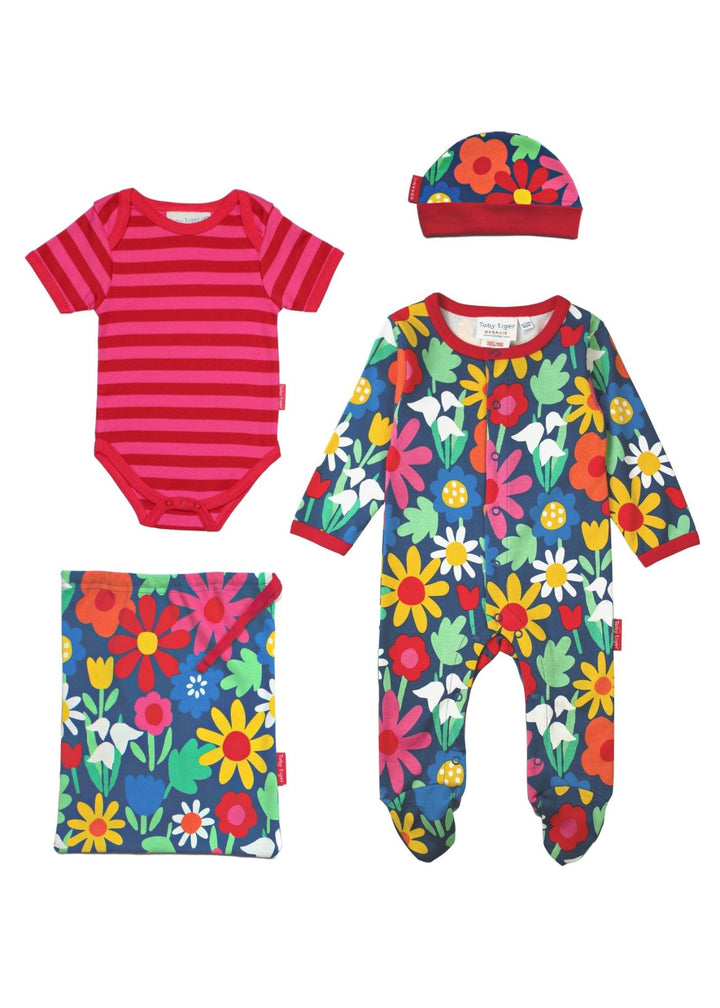 Our bold floral collection is a must-have for an adorable and lasting baby gift! It features a combination of eye-catching designs in dark blue, including snowdrops, daisies, and tulips. Each item in the collection, including the hat, babygrow, baby body and bag, has been crafted with unique detail in mind. Envelope necklines, easy-change poppers, and long-lasting, colourful prints make these organic baby clothes stylish and comfortable. Perfect for your little one!