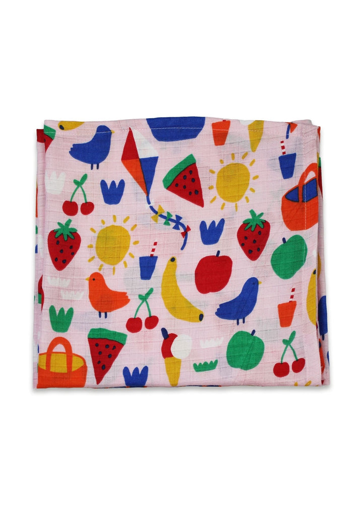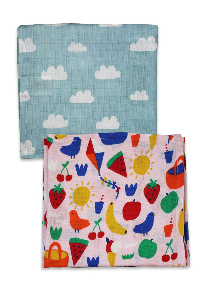 Get ready for a fun picnic with our Organic Picnic Print Muslins! Made with 100% GOTS-certified organic cotton, these muslins feature a playful pink print with fruit, ice cream, and even cheeky ants. The blue muslin with fluffy clouds adds a touch of whimsy. Plus, they're environmentally friendly and easy to clean. Perfect for your little one's outdoor adventures!