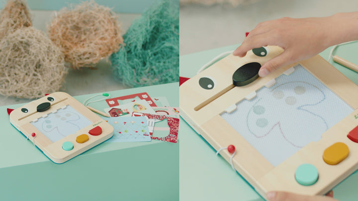 Louis the wolf's magic drawing board provides endless drawing and gaming fun. With different colors, 3 stamps with geometric shapes, 6 cards with 12 games, and a wooden pencil, it engages little hands and minds. Made a mistake or want to create a new drawing? Then Louis's nose erases the drawing board. The game cards are stored in the designated slot on the back, and the wooden pencil is attached with a string to prevent it from getting lost