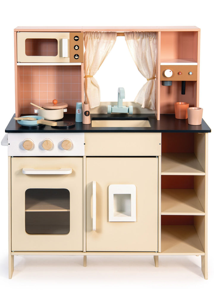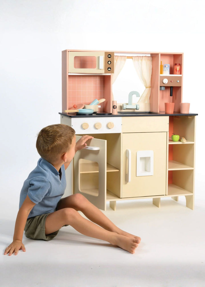 Transform your child's playtime with this stunning play kitchen. Made from sustainable rubber wood, this high-quality toy is ideal for imaginative play and enhancing fine motor skills. See your child's social skills flourish through play with our kitchen and pretend play toys, check out the range here!