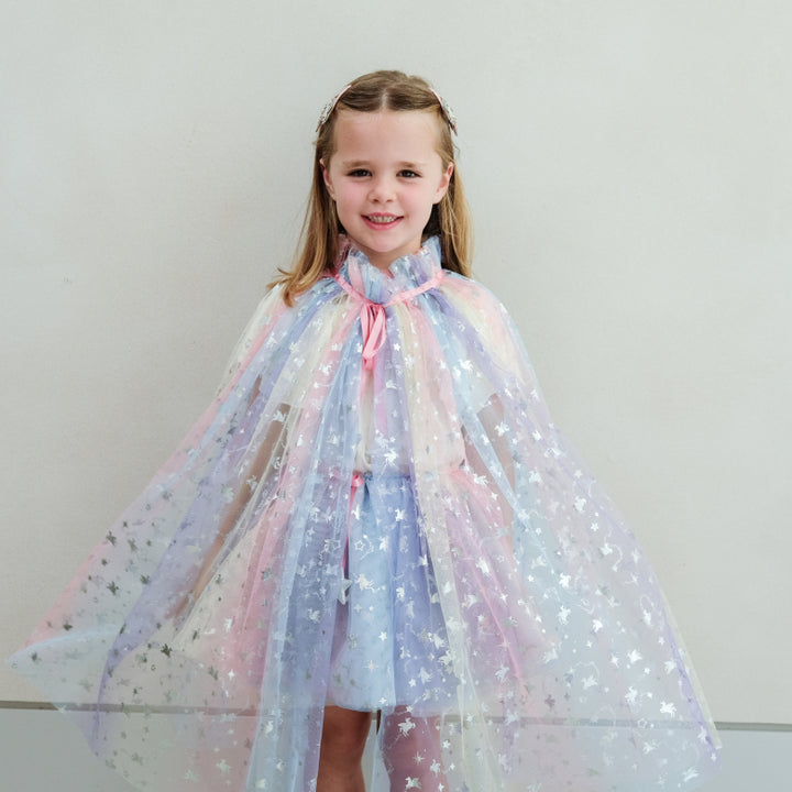 Our magical new Unicorn cape is perfect for parties, playtime or just for feeling extra fabulous! Sprinkled with silver unicorns and stars, this super pretty cape is sure to make them smile!